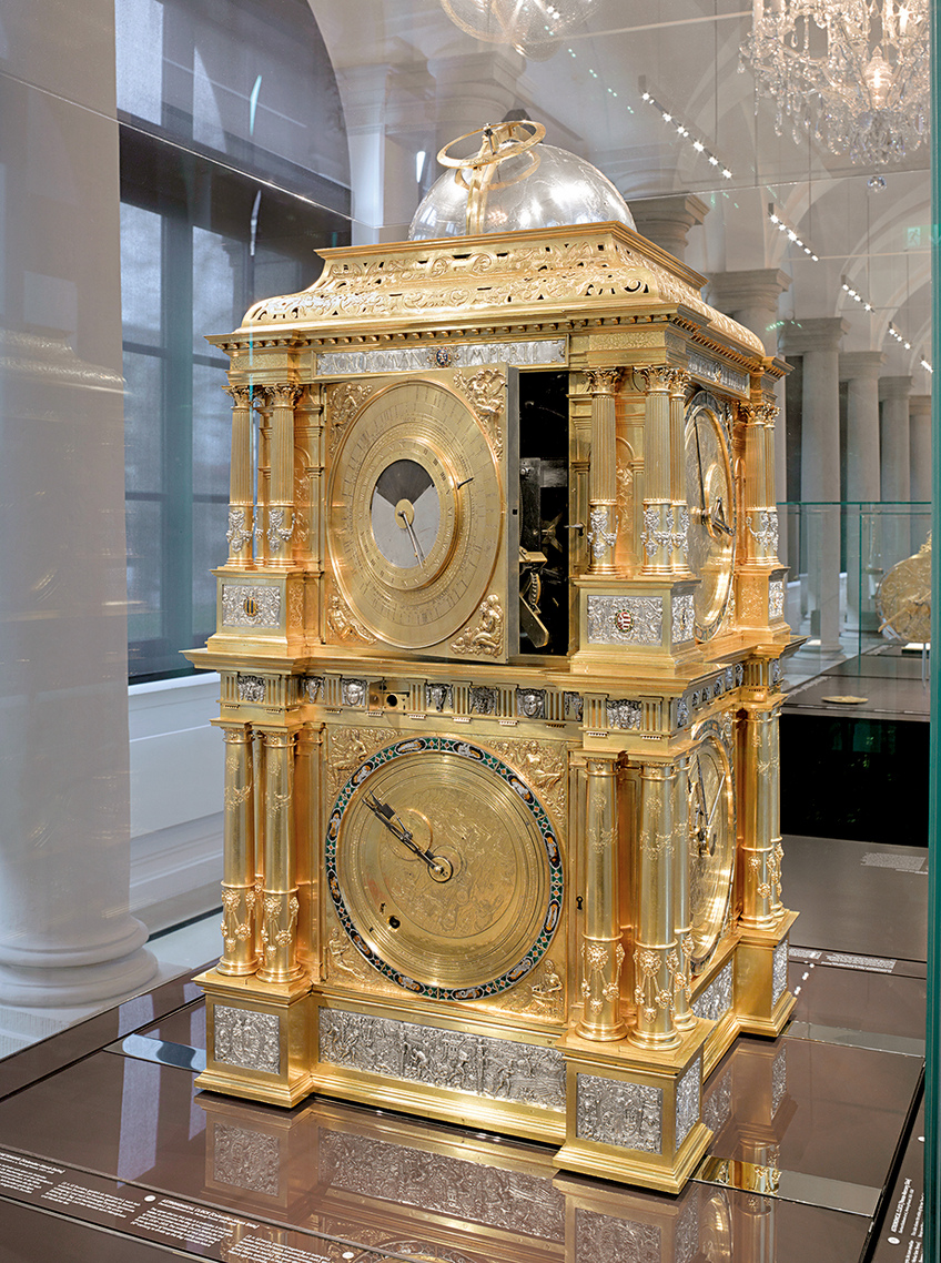 After Eberhard Baldewein had crafted a planetary clock for Landgrave William IV, he was commissioned by elector Augustus to build a further model for the art chamber. With his complex calculation and manufacture of the individual train wheels, some of them asymmetric, Baldewein defined new standards in watchmaking. The lavishly decorated displays of the lunar mechanism show not only the current moon phase but also the position of the moon relative to the sun as well as its progression across the heavens.
