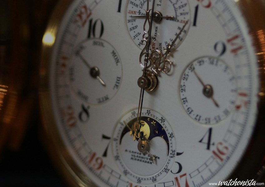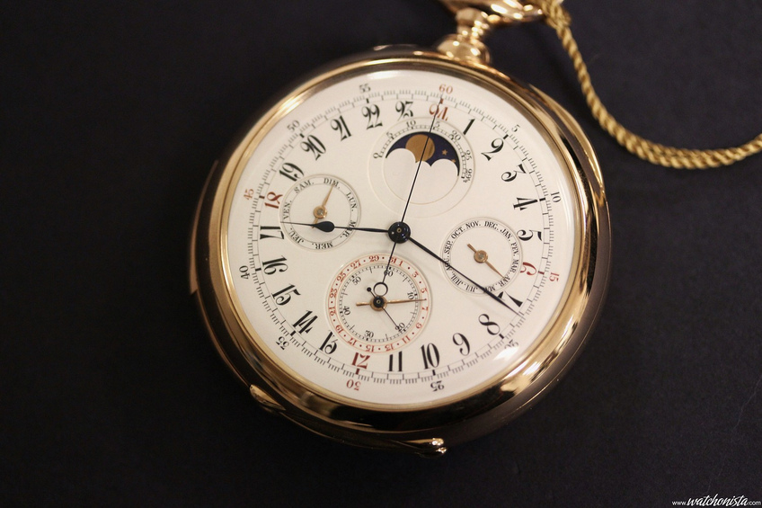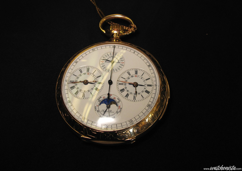 La Lange&Söhne 28218 : une très grande complication de Lange vendue en 1909. Le boîtier savonnette de 59mm embarque : une répétition minute, un chronographe à rattrapante et bien sûr un QP :