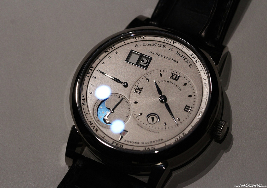 La Lange1 Tourbillon Perpetual Calendar : Un modèle de discrétion pour cette nouveauté du SIHH2012, le tourbillon est complètement caché. Pire ou mieux, selon le point de vue : Ce tourbillon est monté comme si la montre avait un fond plein. De même, le QP se fond très discrètement dans le décor de la Lange1 :