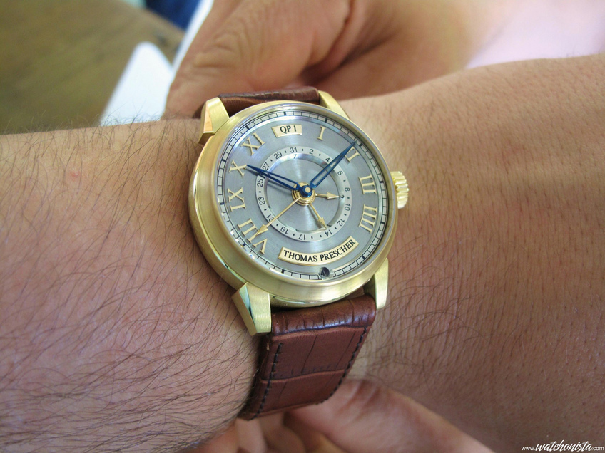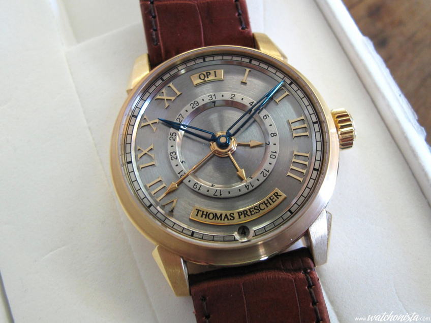 Le QP1 de Prescher : l’un des plus beau QP de l’horlogerie, 39mm. Sa particularité : toutes les indications passent par le canon central (à l’exception du Lap Year, à 6h):