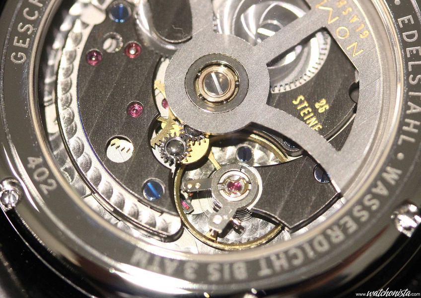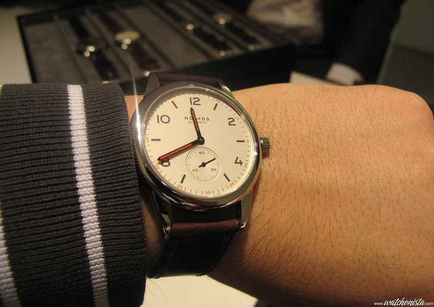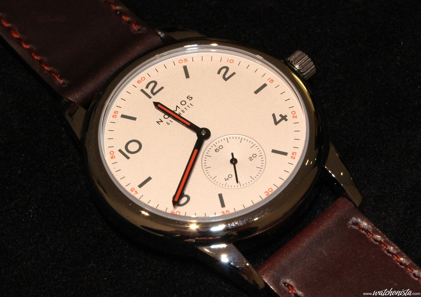 The stainless steel case revisits the Nomos' design in a slightly bigger size, with almost 40mm; but when the watch sits on the wrist, its light colored dial with a large aperture makes it seem like 41-42mm.