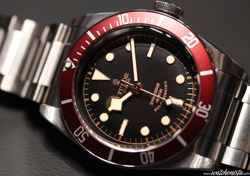 First of all, the most desired? Longed for? Wanted? The Tudor Black Bay. It is definitely inspired by the Tudor 7922-7924 from the 50's; this Tudor, with a professional or even a military purpose, featured a blue bezel, and more rarely a red one.