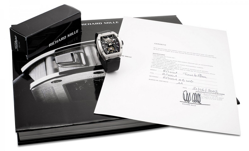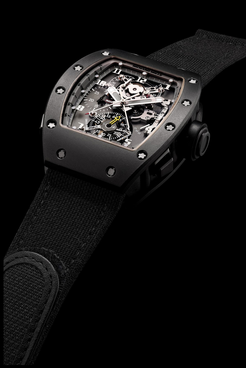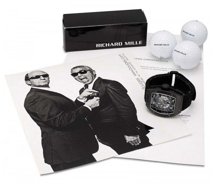 Richard Mille. An important and unique DLC-treated titanium tonneau-shaped split seconds chronograph tourbillon RM008 wristwatch with Richard Mille electric guitar, golf balls, framed drawing of the present movement, original certificate and fitted presentation box. Circa 2006