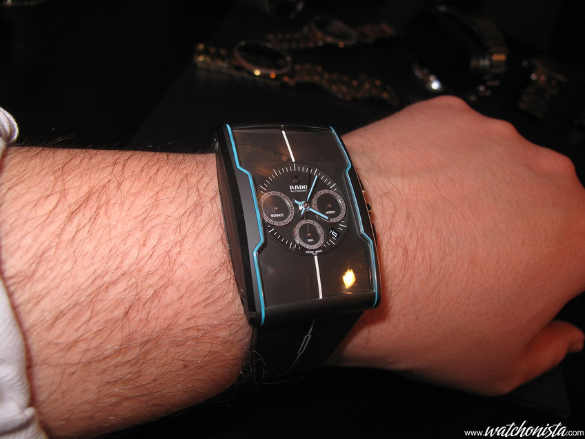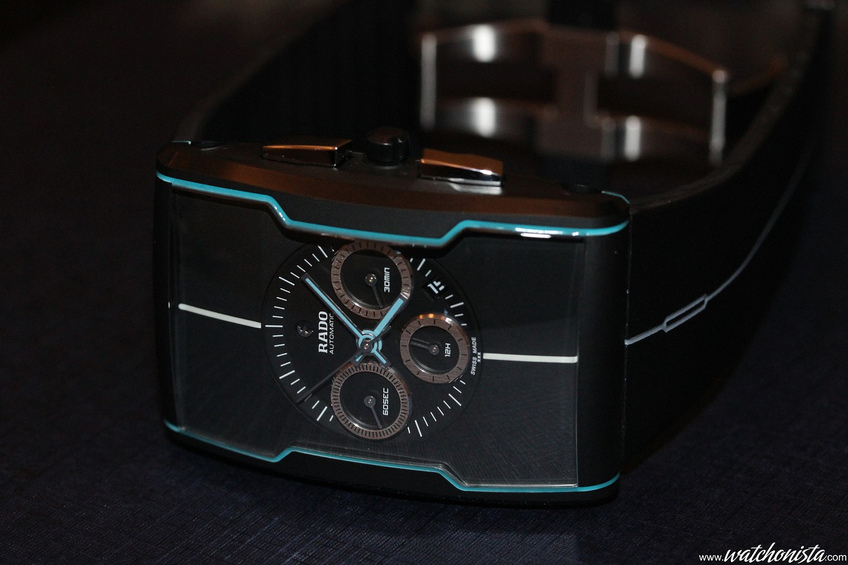 The watch could also be called Tron. The case's curves are enhanced by superluminova coated ceramic insets.