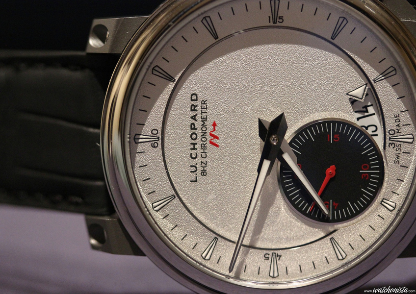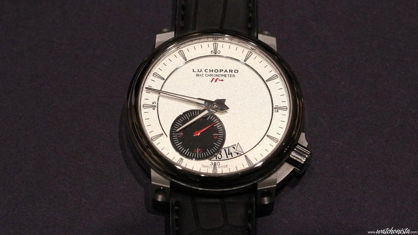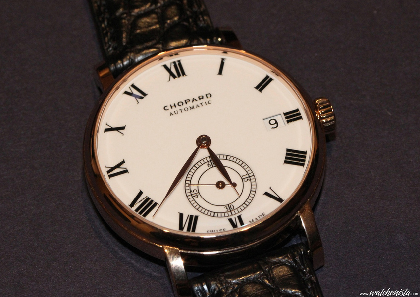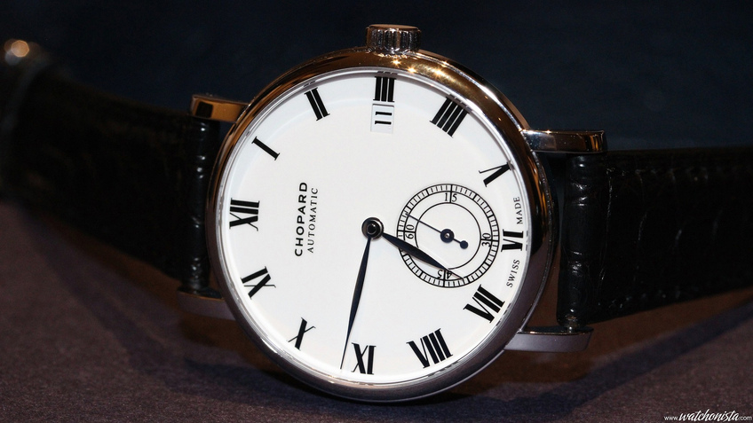 It is almost a start from a blank slate, as the design is so different from Chopard's style. The dial is lacquered in white, with painted roman numerals.