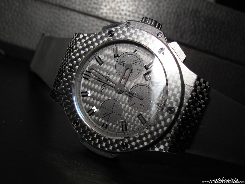 The «BigBang All Black Carbon»: to celebrate the buyout of its provider of carbon fiber cases, Hublot proposes one of its Big Bangs entirely made of this material. The woven fibers (as opposed to «forged carbon») produce a convincing result as, in my opinion, it fits in the initial vocation of theBig Bang, that is a technical case manufactured with High-tech materials, literally a fusion of exotic components. In practice, and it is little known on the forums, carbon fiber (woven or rough) is stacked in successive layers (like fabric layers) which are then impregnated with a two-component resin that, once polymerized, brings its mechanical properties to the compound; The resulting block is then machined into its final shape with a digital tool.