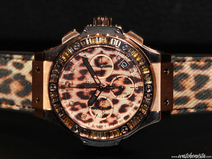 The funniest piece, the «Big Bang Leopard Gold» (yes, it also exits in a «Snow Leopard» version, never seen on the market and appealing enough): 41mm, set with «Andalusite, Smoky quartz and Citrine baguettes», definitely designed for «fashionistas».