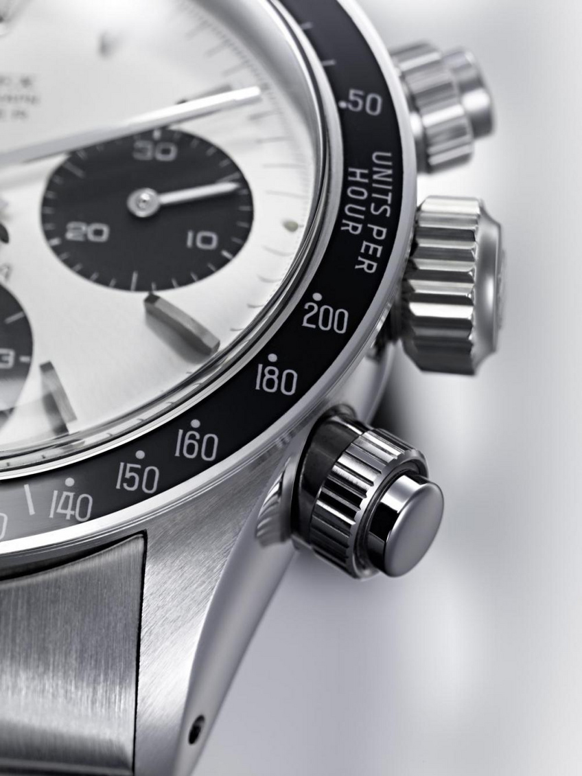 It was therefore launched in 1963, in other words just 50 years ago and one year after the Rolex 24 at Daytona race launched in 1962. The model on show, dating from 1963, sports a black dial with white counters, an engraved outer bezel and non-security ‘mushroom’ push-pieces. As should be the case on all models of this era that you can still find at the auction houses, the steel bracelet has folded metal links, now called the riveted bracelet (very rare to find in good condition). ‘One of the features of this model from the moment it was first created to 1977, was the play on colour contrast between the background of the black or white dial and that of the three counters at 3, 6 and 9 o’clock.