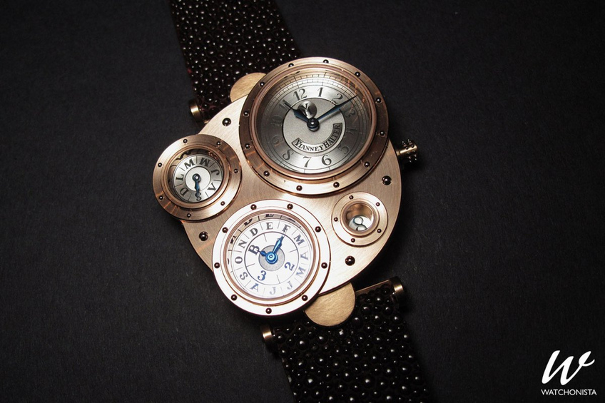 Opus 3, Harry Winston (2003). The watch has six circular windows showing the hour, minutes and date. It breaks with classic watchmaking conventions by having no hands. Limited edition of 55 pieces.