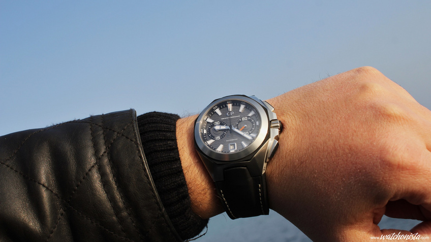 In terms of movement, this timepiece is equipped with the self-winding GP3300 calibre. Equipped with approximately 46 hours of power reserve, it benefits from an impeccable finish, as it is the tradition in Girard-Perregaux. Pulsating at a frequency of 4 Hz, it can be seen directly through the sapphire glass that covers the bottom of the case. This is the opportunity to observe the work done on the oscillating weight as once more, it opposes the aggressive lines to the curves of the overall design.