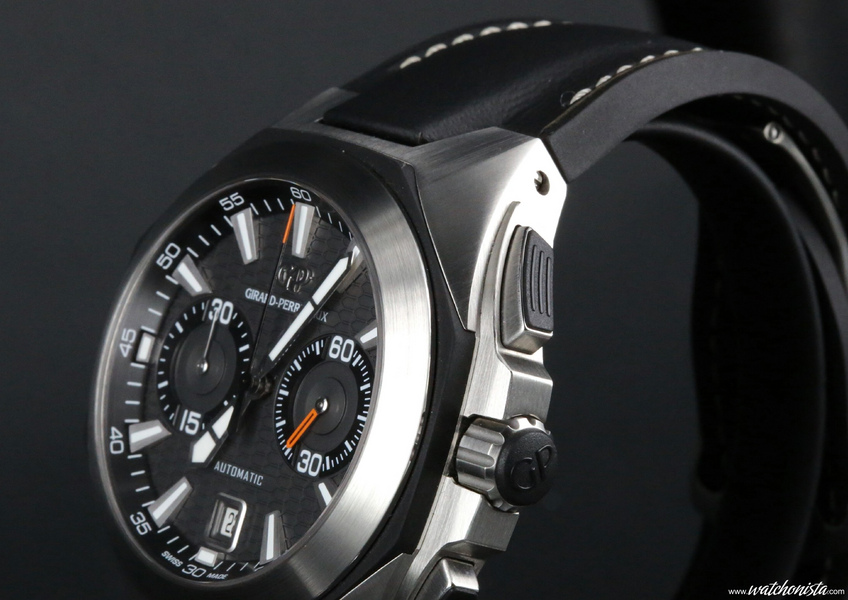 In terms of readability massive indexes and large central hands characterize this Chrono Hawk, offering an elevated surface to accommodate the Super-LumiNova. Thanks to this the elements necessary for reading time are clearly visible when the watch is plunged into darkness. The symmetry of the dial is reinforced by the minutes counter of the chronograph facing the small second at 3 o’clock, which emerges particularly thanks to its orange hand. Finally, the date window at 6 o’clock is clearly isolated, which gives to the whole an improved readability of each function.