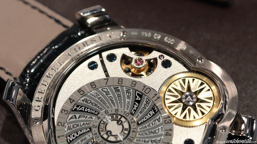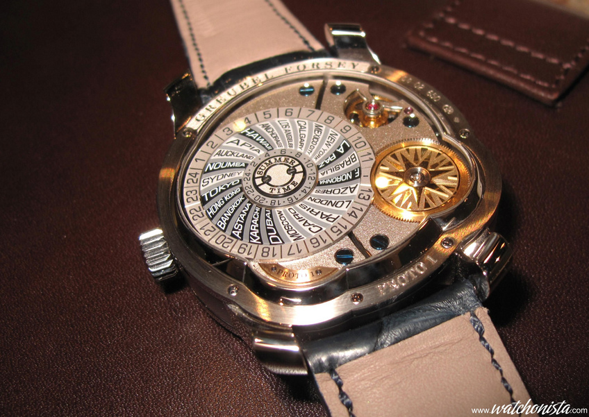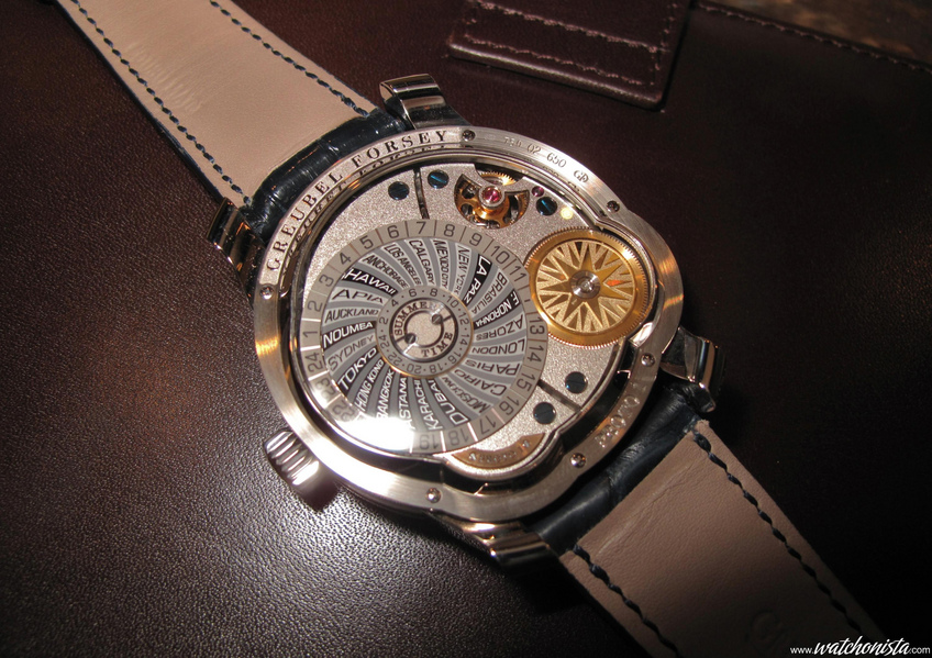 Digression: Like most of the productions by GF, the watchcase features an aperture on one side, which allows the globe to be visible through a transparent sapphire.