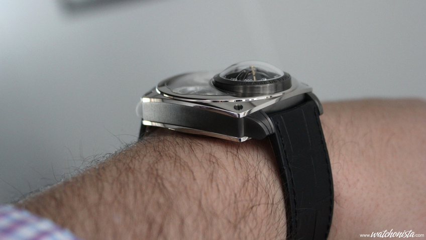 Moreover, when worn on the wrist, the watch looks far smaller than the previous HdT and it is not only an impression: it is at least 1.5mm smaller than the older models (47mm vs. at least 48.5mm); it is also the slimmest of the series, it looks even slimmer than the HdT3.
