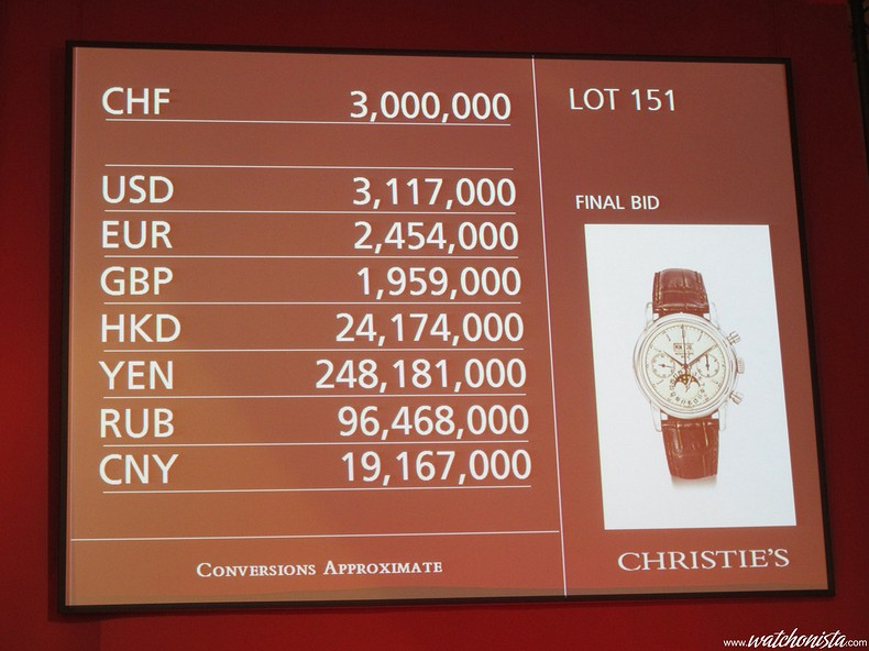 The morning ended with the final bid on the lot 151, a platinum Patek Philippe ref. 2499/100, sold for 3'000'000 CHF. Only two copies of this model have been produced with a platinum case.
