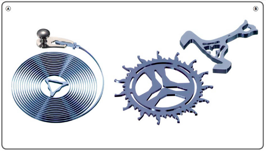 (A) The Patek Philippe Spiromax balance spring (B) The Patek Philippe Pulsomax escapement
