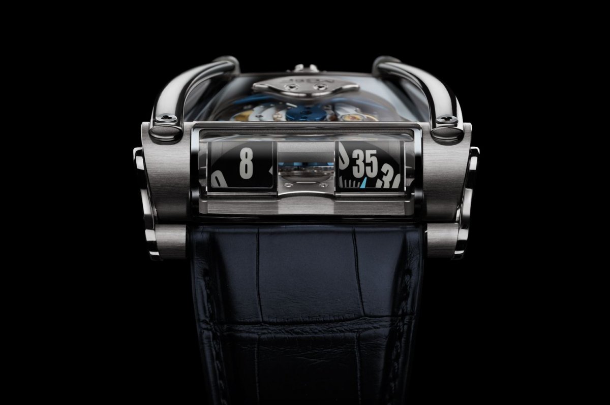 Changing the sequence was out of the question, because in fact –by happy happenstance –this timepiece does look like an esthetic contraction, both architecturally and functionally, of the HM3 and the HM5. From the former, it inherited the blued rotor shaped like a battle axe in 18-karat gold on the dial side. Of the latter model, it has picked up the lateral time display, a tribute to the angular Amida watch of the 1970s, or the famous Casquette by Girard-Perregaux, as well as to their prismatic display.