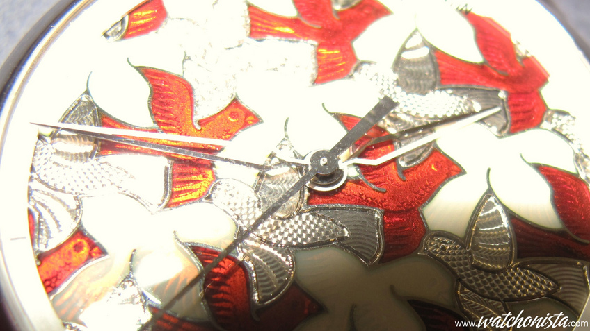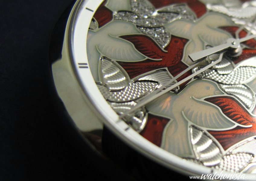 First of all, the dial is hollowed (« email champlevé » technique) and engraved with the dove’s pattern, which are then enameled, with a translucent finish for the red, opaque for the white. After firing, one of the doves is set with diamonds. Finally, the most delicate stage takes place, the remaining doves are « hand-guillochées »