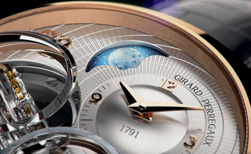 There is something hypnotic about the large, 10.15-millimeter balance wheel with variable inertia oscillating at 21,600 vph (3 Hz) at 6 o’clock. The size of the balance wheel makes it less vulnerable to turbulence, so it's more precise. Furthermore, to maintain the sense of equilibrium, the barrel acts as a kind of counterweight to the microrotor of the automatic winding system, which delivers up to 48 hours of power reserve.Another marvel: the Planetarium Tri-Axial. This timepiece reveals Girard-Perregaux’s mastery of high-precision movements. The tridimensional Planetarium combines a tri-axial tourbillon that moves in space, a globe that makes one turn every 24 hours, and, as the cherry on the cake, an astronomical moon phase. The earth complication can be adjusted as a GMT function or as a day/night indication, since the geographic zones are a little difficult to see with the naked eye.