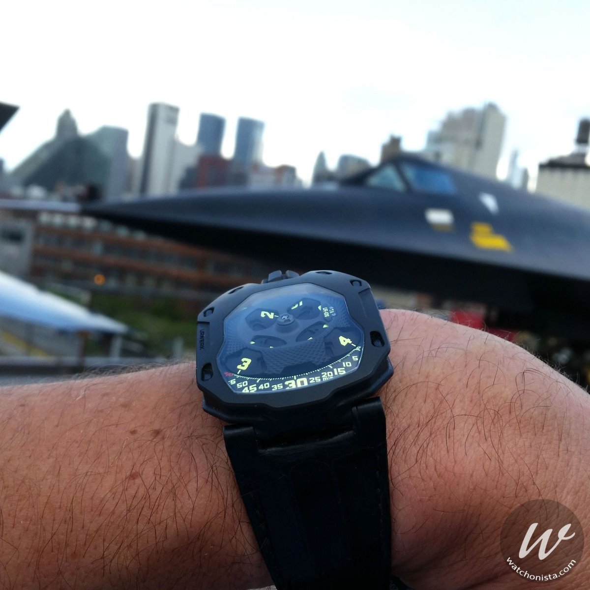 I take a closer look at the watch. Just like all of the brand’s other models, it has a nickname. The titanium/steel version is known as the “Urwerk Knight” whilst the two somewhat surprising acid versions are known as “Black Orange” and “Black Lemon”. The watch is also available in an alloy of titanium and red gold.