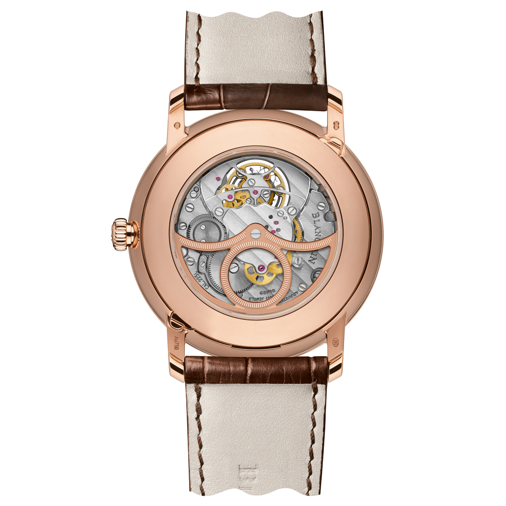 The back of the 42 mm-diameter case carries the two under-lug correctors designed to adjust the date and moon phase. This patented Blancpain innovation enables smooth tool-free handling and also serves to preserve the pure lines of the case. The same concern for detail is devoted to the finishes which are visible through the sapphire crystal case-back providing a view of the movement adorned with Côtes de Genève as well as the openworked and striated oscillating weight distinguished by a design echoing that of the carrousel carriage. An alligator leather strap in chocolate brown for the 18-carat red gold version, or black for the platinum limited edition, sets the perfect finishing touch to the pure and elegant aesthetic appeal of this model.