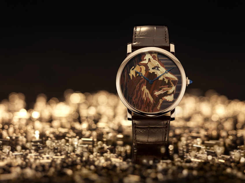 Cartier had the wonderful idea of using straw marquetry to create this feline. The subtle gradations of colour in the lion’s mane are captured perfectly by the warm shades and silky brilliance of this unusual material. The stalks of straw with their infinite nuances of colour are individually selected, split, flattened and cut with a marquetry saw. Their six natural tones, ranging from golden to red, combine in a powerful image that is further enhanced by a play of perspectives and creatively cut shapes. Straw is a material that is rarely seen in watchmaking and that Cartier began using two years ago for its delicacy and unique softness.