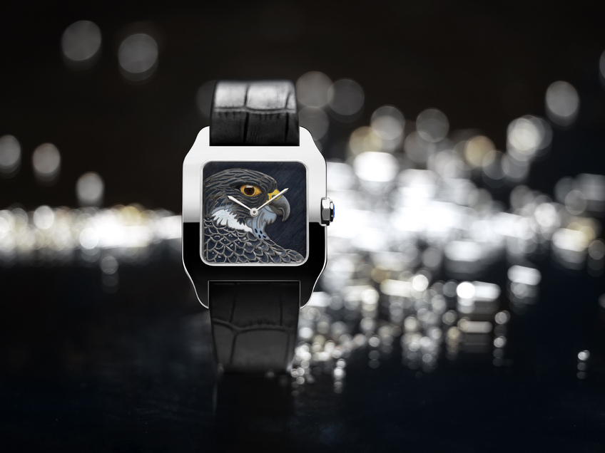 Cartier’s aim in producing this Santos XL watch was to bring out the hypnotic intensity of the predator. The engraving and the enamel in subtle shades of grey and blue-tinged black bring the falcon to life. The solid surfaces and cavities of the engraving create the relief on the wings and the contrasting mosaic of feathers and downy fluff. All the details are carefully depicted and stand out strongly against the matt mineral black background, from the beak to the gently curved eye in orange-tinted enamel with a pupil that is stunningly realistic, penetrating and alert.