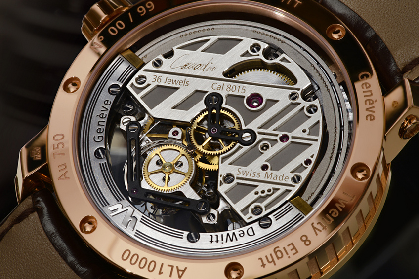 Last but not least, the new DW 8015 movement fully complies with the very demanding finishing norms established by the DeWitt Manufacture: Circular Côtes de Genève, satin-brushed surfaces, circular graining, polishing and bevelling.