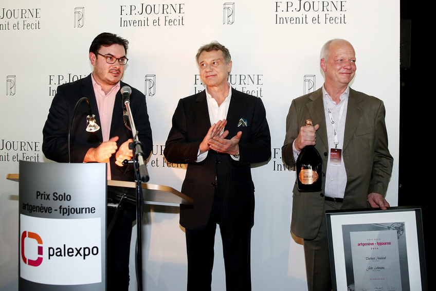 François-Paul Journe awarding the Prix Solo artgenève-F.P.Journe with, to his left, Thomas Hug, Director of artgenève and his right Ralf Lehmann from the Gallery Gebrüder Lehmann / top image: Launch of the Pendule de Foucault by François-Paul Journe and artist Christian Walvogel.
