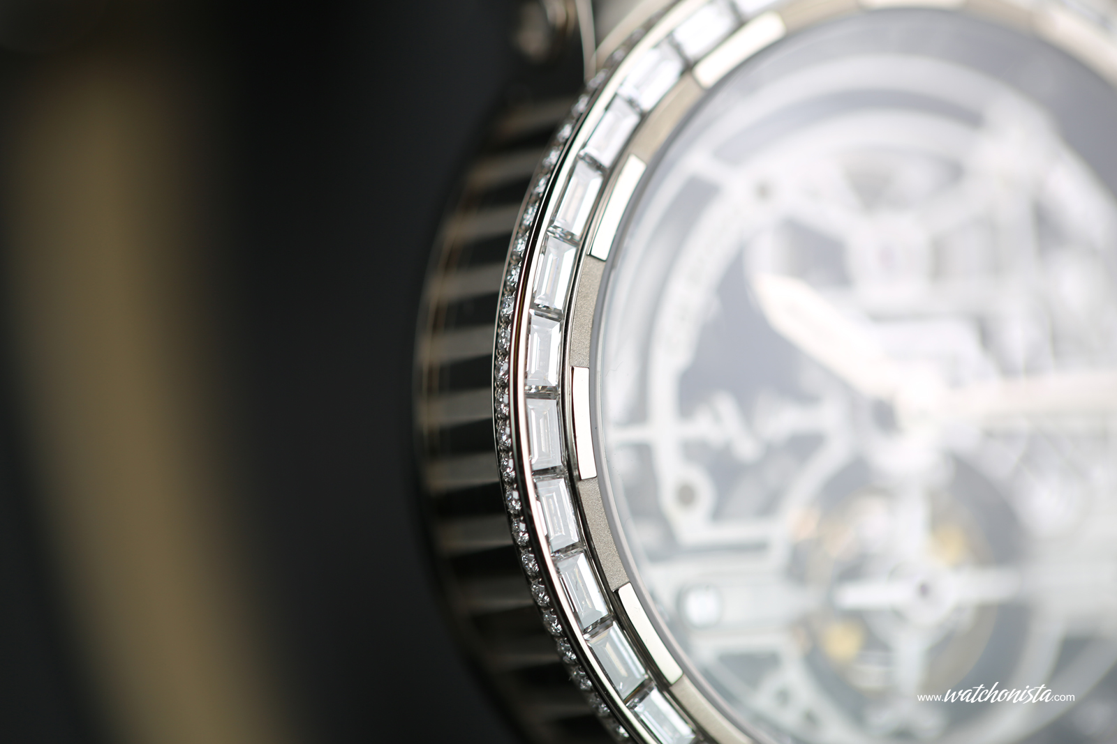 Son rehaut est également incrusté de 8 diamants taille brillant, mettant ainsi en valeur les index des heures.
