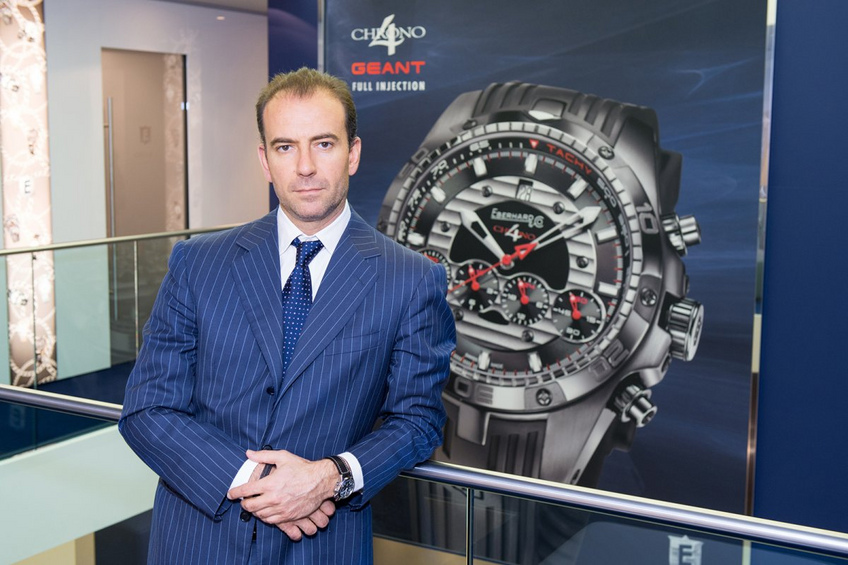 Au poignet de mon voisin de droite, Marco Peserico, Directeur Général d’Eberhard & Co - marque horlogère suisse créée à La Chaux-de-Fonds en 1887 - j’espérais découvrir un modèle dédié au pilote de légende. En fait, je l’aurais bien vu arborer l’un des exemplaires de la série limitée Tazio Nuvolari 336, lancée en 2015 et inaugurant dans la collection au nom du pilote le premier double-fuseau horaire, écartant de simplicité d’usage. Ce modèle «Dual Time» de 54 mm de diamètre, étanche à 100 mètres, m’avait tapé dans l’oeil, avec à 12h00 l’indication du second fuseau, une réserve de marche à 6h et une date enguichetée à 3h00. Ou alors, une édition plus ancienne qui m’avait interpellé à une époque où, quelques années plus tôt, je commettais quelque lancement de magazine horloger pour le compte de Ringier.