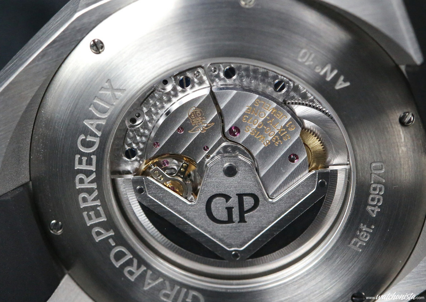En termes de mouvement, ce garde-temps est équipé du calibre GP3300 à remontage automatique. Doté d’une réserve de marche d’environ 46 heures, il bénéficie de finitions irréprochables comme c’est la tradition chez Girard-Perregaux. Pulsant à une fréquence de 4Hz, il peut être admiré au travers de la glace saphir qui recouvre le fond du boîtier. L’occasion d’observer le travail effectué sur la masse oscillante puisqu’une fois de plus, il oppose les lignes agressives aux rondeurs du design général.