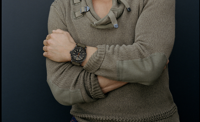 C’est au travers de la collection RL 67 Safari - en référence à l’année de création de la marque - que Ralph Lauren exprime son allergie aux dates qui peinent à se laisser lire. Au cœur d’un diamètre de 50 mm, une taille assumée et sans complexe, trône un large guichet qui laisse apparaître la comptabilité décimale d’une grande date. Au calibre Sellita 300-1 s’est ajouté un module Val Fleurier dédié à la date. Le cadran se veut tapissé façon camouflage ou carrément foncé. Il est entouré par une carrure en acier PVD vieilli à la main afin qu’un effet de déjà porté s’en dégage. Après tout, Ralph Lauren, en marge de sa collection réputée de bolides anciens, n’est-il pas aussi un sacré collectionneur de garde-temps vintage?