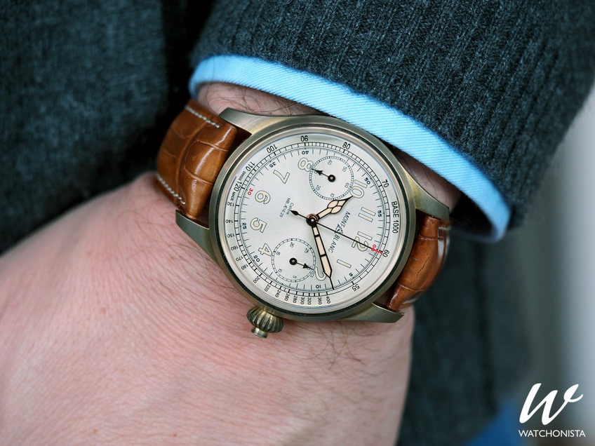 Pour entretenir le caractère «vintage» de cette montre de 44 mm de diamètre, le cadran portant une échelle tachymétrique (pour la mesure de la vitesse sur 1 kilomètre) présente une teinte champagne qui s’harmonise à merveille avec la carrure de ce chronographe. Proposé à 100 exemplaires, ce modèle se dote d’un seul poussoir inscrit dans la couronne de remontoir pour entretenir cette finesse d’ensemble, et reçoit un fond en titane traité teinte bronze enserrant une glace saphir, pour permettre aux passionnés de découvrir les finitions exceptionnelles de ce calibre de manufacture référencé MB M16.29. Comme toute pièce sortant de l’ordinaire, cette référence a fait l’objet de nombreux tests et voit par conséquent sa qualité certifiée par le Montblanc Laboratory Test 500 (heures).