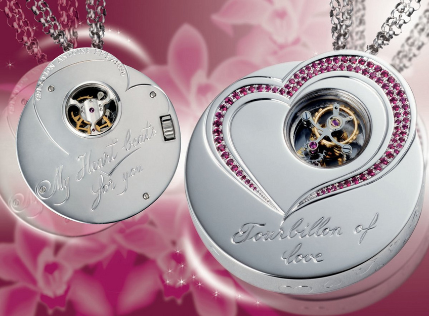 A première vue, ce bijou «Tourbillon of Love» imaginé par Laura Preziuso, la fille d’Antoine, le grand horloger créateur, est un simple pendentif. Certes, il est en or blanc sur lequel, c’est de circonstance, le dessin d’un cœur a été tracé à partir de rubis sertis. Au centre, emprisonné comme un petit cœur dans le cœur principal, un mécanisme de tourbillon fonctionnel, en mouvement. Hormis le fait que son esthétique se suffise à elle-même, le message qui se dégage de cette précieuse création est riche en symboles: «Avec toi, le temps a si peu d’emprise que même un tourbillon peut faire l’économie de sa fonctionnalité chronométrique pour ne se consacrer qu’à sa beauté mécanique.»