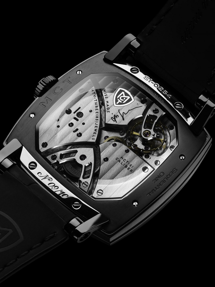 Alors tout cela est bien beau, mais le rendu de cette montre où ce noir placé sur le fond du cadran et à la pointe de la trotteuse est finalement impossible à décrire car la photo sur un écran est incapable de retranscrire cette profondeur que perçoit l’œil quand il cherche à trouver une résonance lumineuse dans la matière tapissant le fond du boîtier. D’une certaine façon, cette pièce de 45 mm de diamètre en titane grade 5 emportant le calibre MCT-S1.0 à remontage manuel développé et assemblé au sein de l’entreprise est fondamentalement indescriptible tant le noir est noir. Aussi, pour saisir combien même une simple couleur peut redimensionner en profondeur un produit horloger au point de faire se distordre le temps dont il est une pure émanation, il faudra se rendre sur le stand de MCT Watches et expérimenter la sensation de vide sidéral en regardant le temps passer… A voir!