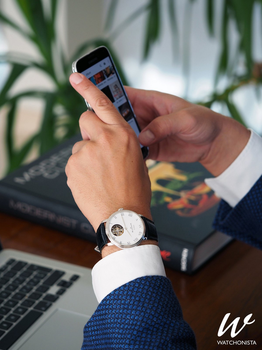 Si il m’aura fallu bien du temps pour isoler les différentes qualités de cette Blancpain, la porter permet d’en apprécier immédiatement la justesse. Le tombé du bracelet en alligator convient même aux poignets XXS, comme le mien… Suffisamment rare pour être souligné! La vision du tourbillon est quasi hypnotique mais malgré la large ouverture, cette animation n’est pas tapageuse. Les aiguilles feuilles de sauge évidées se détachent de l’ensemble ramenant la lecture du temps au premier plan. La charge de la montre est efficace sans pour autant que les rotations de la masse oscillante virent au désagréable pour le porteur.