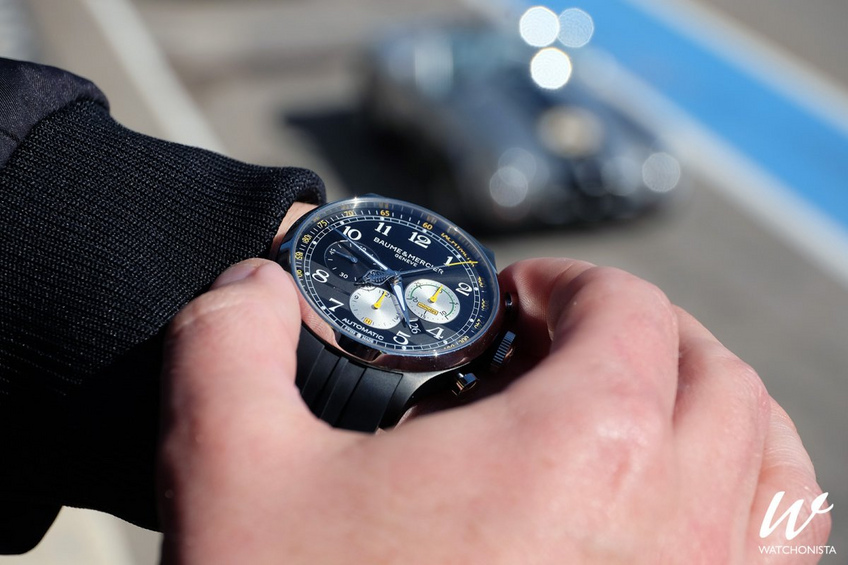 Après l’avoir porté une quinzaine de jours, nous avons clairement ressenti que l’originalité de cette montre intriguait nos interlocuteurs. La couleur jaune est assurément le point segmentant. D’aucuns adorent, d’autres estiment qu’il ne sied pas à une montre de qualité. Chacun jugera. Au-delà de cela, quelques évidences: il s’agit bel et bien d’un chronographe éminemment sportif, très typé et immédiatement identifiable. Baume & Mercier n’a en effet pas lésiné sur les codes et les symboles en référence à Shelby Cobra. Le risque avec ce genre d’exercices, c’est d’en faire un peu trop. On est ici à la limite, mais personnellement nous apprécions cette claire affirmation d’appartenance.