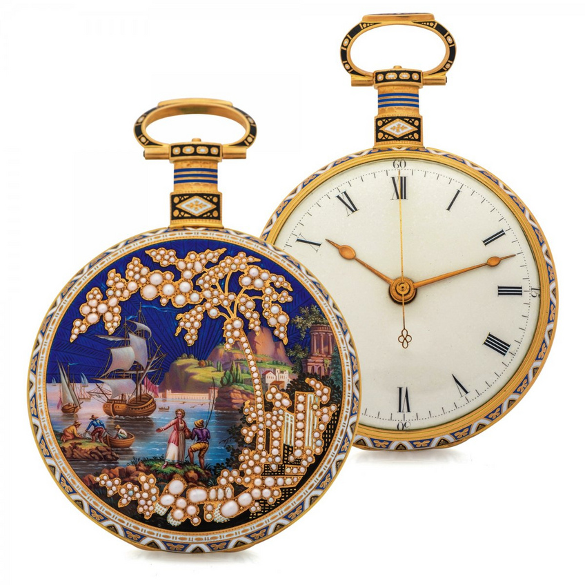 En feuilletant les pages des catalogues, on se rend compte que le choix de montres en émail est tout aussi remarquable. Initialement mes yeux sont rivés sur le lot 158 d'Antiquorum: une scène scintillante de champlevé et d'émail peint représentant A grand view of the seashore (une belle vue sur le rivage), attribuée à Jean-Louis Richter (1766-1841) et signée par William Ilbery, horloger anglais. Ensuite, j'aperçois que Christie's offre aussi une très belle pièce en émail polychrome par ces mêmes artisans dans le lot 80, aussi bien qu'une montre de poche très fine par Patek Philippe (lot 205) qui semble avoir été conçue avec la plus élégante des femmes comme inspiration. La Milkmaid selon Vanmeer par Suzanne Rohr, représentée sur une montre de poche Patek Philippe dotée du calibre 17-140 est tout aussi belle. Mais il n'y a point de doute que la star de cette saison sera la Rolex réf. 6085 illustrant "The Dragon" et estimée dans la fourchette de 500'000 - 1'000'000 CHF chez Phillip's. Et si on me demande la pièce que je préfère, je pencherai pour la harpe au design réaliste offerte par Sotheby's.
