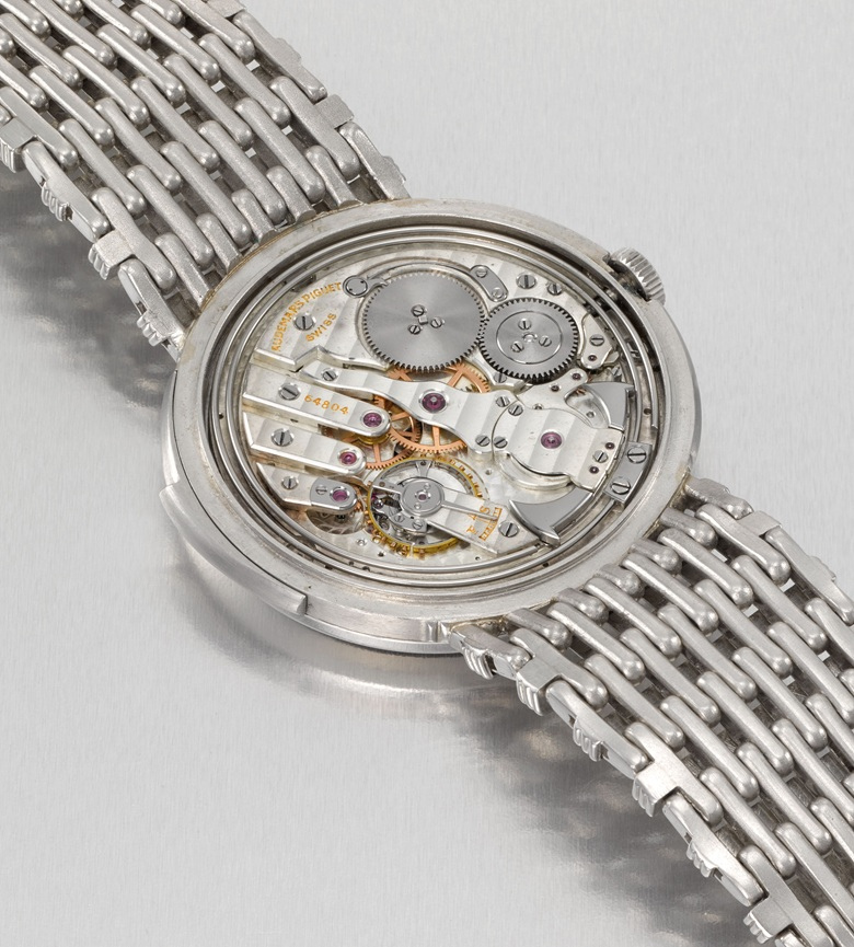 En effet, une des complications les plus recherchées aujourd'hui, la répétition minute est un mouvement difficile à assembler et à régler. Exercice rendu encore plus difficile à réaliser de par la finesse de ce calibre 13'''JMV. La fabrication complète de ce type de mouvement était très limitée par la rareté des horlogers maitrisant le savoir-faire nécessaire à sa réalisation. Tandis que les recherches menées par Audemars Piguet montrent que la pièce en question est une des deux répétitions minutes en platine parmi un total de sept mouvements créés avec cette fonction entre 1945 et 1960, la deuxième pièce en platine se pare d'un calibre 12'''PMV. Cerise sur le gâteau, c'est là une des trois uniques pièces à être sorties de la manufacture servies sur des bracelets. C’est là non seulement une pièce totalement unique mais aussi très attirante et exceptionnelle.