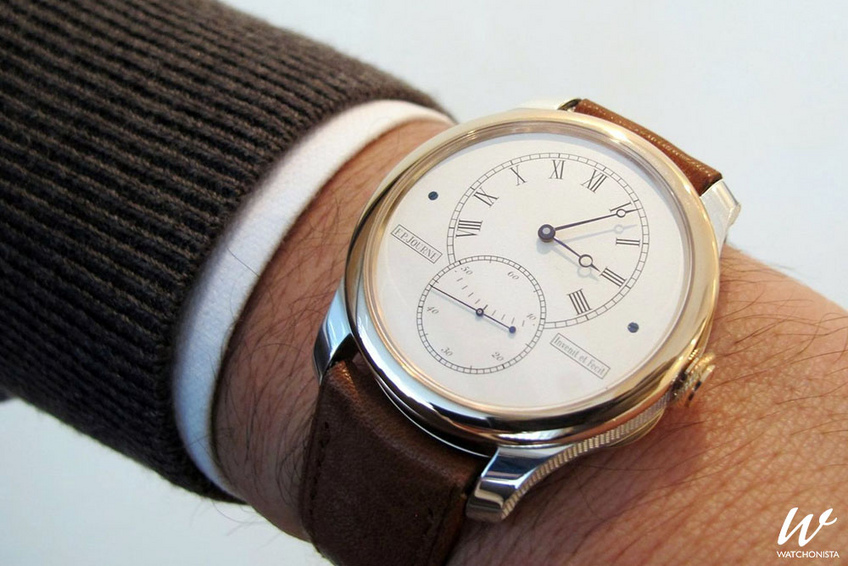 F.P. Journe, qui a souvent reconnu s'être inspiré d'Antide Janvier dans ses créations, est aussi très bien représenté grâce au lot 62 de Christie's. Une construction très intéressante intégrant un mouvement à double barillet et un tourbillon faisant une révolution en une minute. Son affichage ressemble à celui d'un régulateur avec les heures et les minutes excentrées et les secondes à 6 heures.