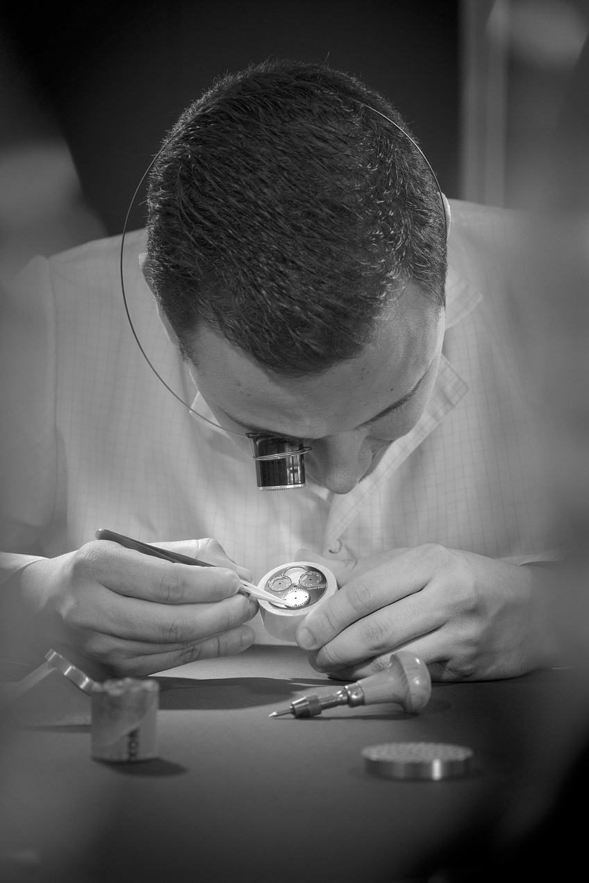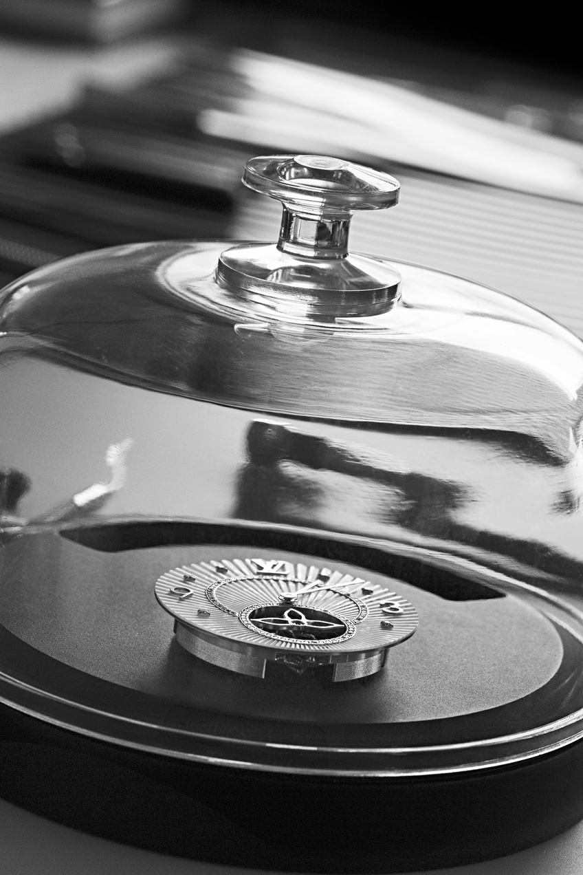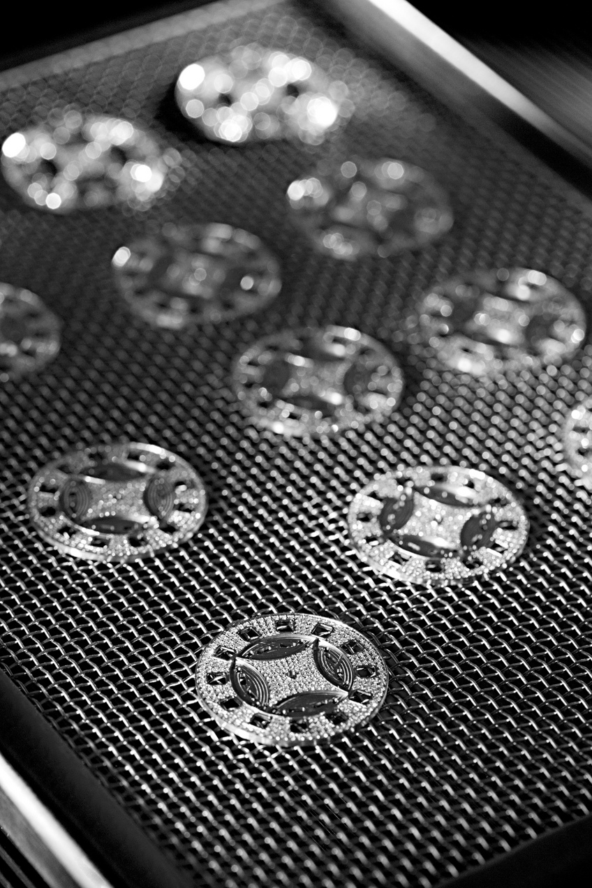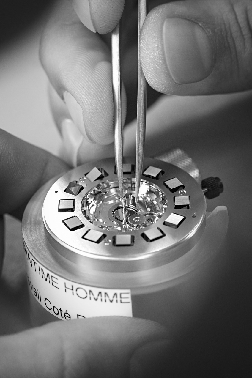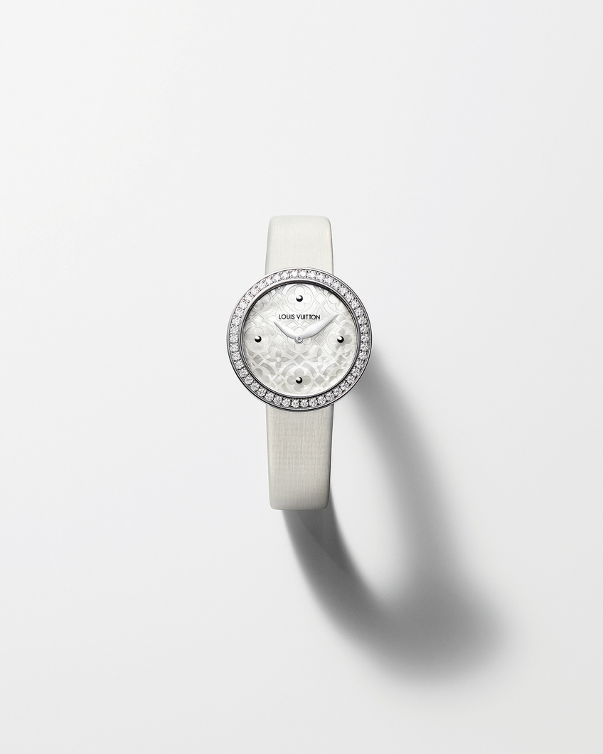 Chez Louis Vuitton, la même exigence d’excellence se retrouve aussi bien dans le travail des joailliers, place Vendôme à Paris, que dans celui des horlogers de la manufacture, à Genève en Suisse. Et quand les talents et les savoir-faire s’unissent, naissent alors des pièces d’exception comme la montre Dentelle de Monogram. Pour ce modèle, les créateurs s’inspirèrent de la collection de haute joaillerie « Voyage dans le Temps » avec un cadran en nacre perlée blanche ou de Polynésie ajouré reprenant l’emblématique Monogram de la Maison, qui rehausse l’éclat de la lunette sertie de diamants. Mais ils se retrouvèrent face à un défi apparemment impossible : réduire un disque de nacre naturelle à une épaisseur la plus fine possible avant de sculpter les motifs. Ce n’est qu’au terme de patients travaux de recherche effectués par toutes les équipes que l’effet souhaité fut exactement obtenu. Et c’est ce véritable ouvrage de dentelle sur une matière aussi fragile que la nacre qui inspira le nom du modèle. Le mariage du talent joaillier et de l’art horloger trouve ici sa plus belle expression, grâce à l’esprit d’innovation d’artisans passionnés.