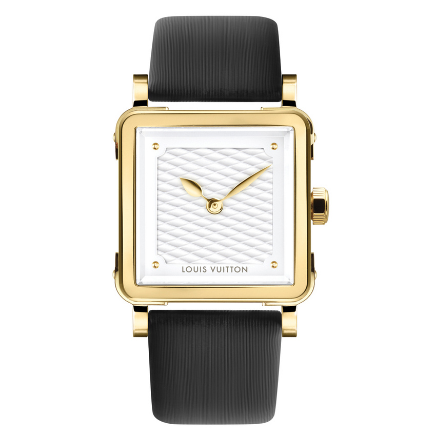 On y retrouve les éléments structurels de la malle : malletage et coins qui deviennent des leitmotivs décoratifs et tracent des perspectives fortes. Le bracelet s’habille tantôt de satin poudré, tantôt d’un cuir embossé gros grain.Heures du jour ou du soir, moments