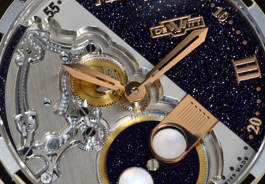 Cette trajectoire visuelle se clôt sur l’infini céleste, ornant la partie droite du cadran, symbolisée par le Goldfluss. Ce verre de synthèse, produit avec du cuivre et une cuisson particulière selon un très ancien procédé, a été découvert à Venise au XVIIème siècle et donna naissance au célébrissime verre de Murano.