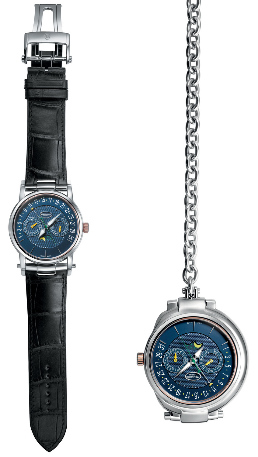 Avec son fond en grain d’orge symbolisant des vagues, la deuxième tête de montre, le Qantième Annuel, se pare d’un bleu profond, galvanique, fidèle à la définition pantonne de la CBF. Le vert est ici incarné par le saupoudrage de 5 étoiles réparties sur le disque lunaire, appelées à apparaître et à disparaître, en une valse céleste poétique, au fil de la déclinaison des phases de lune jaune-or. Hormis ses fonctions heure, minutes et secondes, la pièce décline les jours de l’année au moyen d’un mécanisme compliqué qui, une fois par année au mois de févier et à l’exception des années bissextiles, offre un ajustement automatique en sautant du 28 au 1er, sans passer par les cases 29, 30 et 31. Cette deuxième montre, également de 43 mm de diamètre, est en or rouge. Elle se laisse métamorphoser tantôt en montre de poche, tantôt en pendulette de table à remontage automatique. L’extérieur du cadran est opalin. Ses index appliques fuseaux divisent le temps via des aiguilles également de forme Delta. Pour le cuir, l’étanchéité et les finitions, cette deuxième se calque sur les vertus de la première.