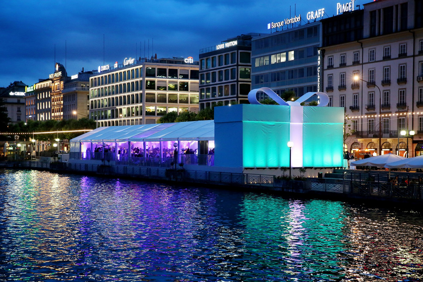 Suite à la réception dans la nouvelle boutique, les invités ont été conduits dans une magnifique tente avec une entrée en forme de Tiffany Blue Box. Avec une vue splendide sur le lac de Léman et le Jet d’eau, les invités ont dansé au rythme de la célèbre saxophoniste Chez Taylor-Francis, DJ Mike et DJ Viky Queen.