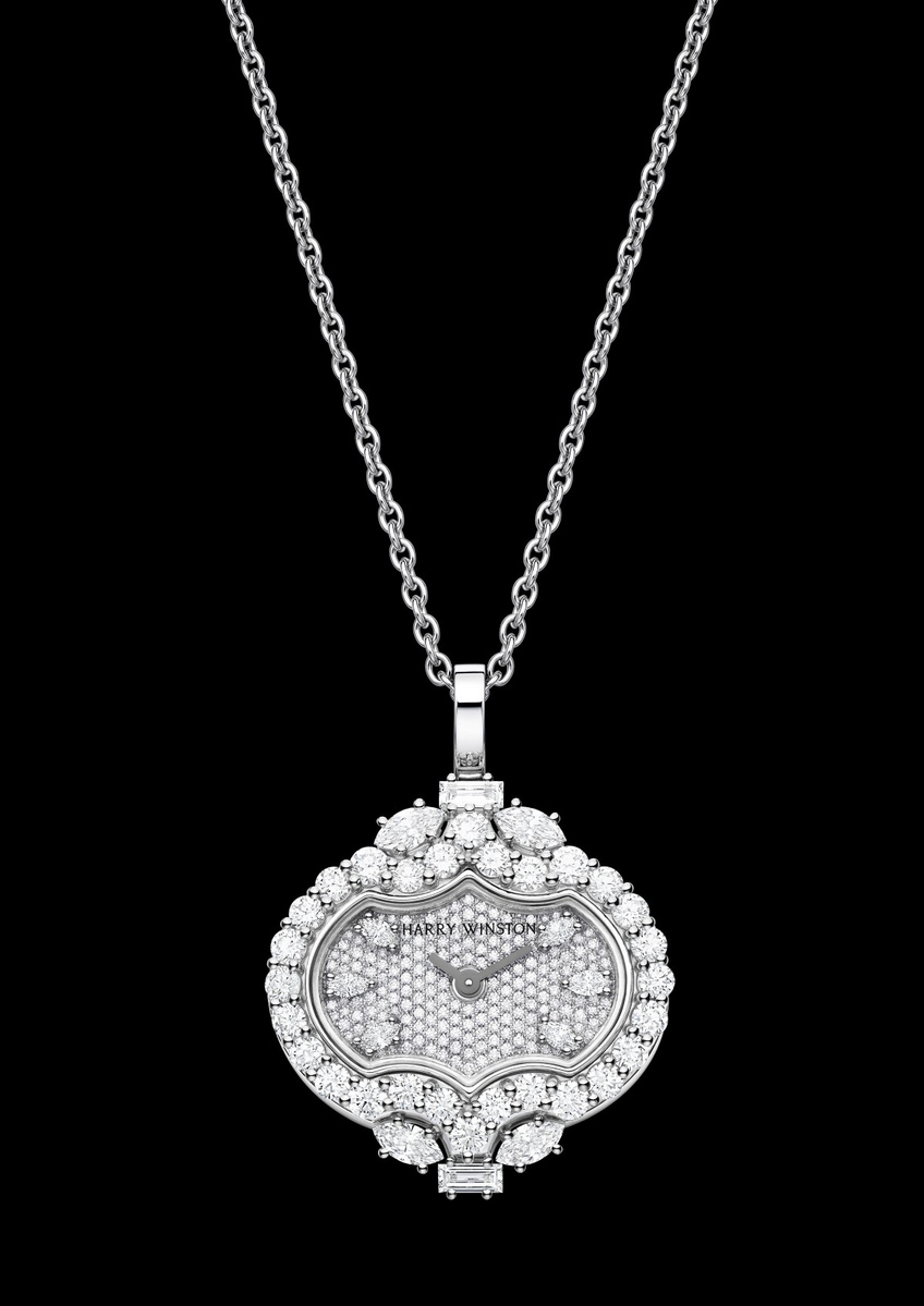 Pendant watches have always been a glamorous way for women to wear their timepieces and are currently making a revival on the high jewelry scene. Last year, Harry Winston unveiled the romantic Rosebud Heart. In continuing in this tradition, this year, Harry Winston presents Divine Time, a high jewelry timepiece destined to attract women who value versatility and the spectacular sparkle of fine diamonds.
