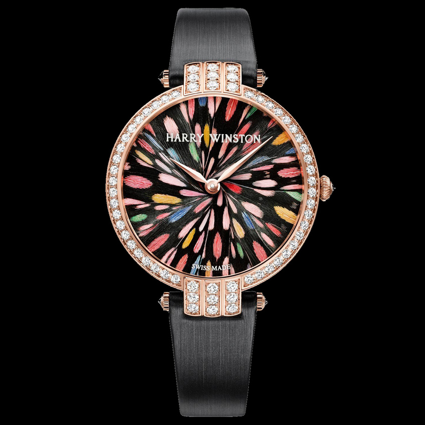 The 36mm, 18K rose gold case, set with 66 brilliant-cut diamonds, sensually dresses the wrist while three iconic arches at 12 o’clock and 6 o’clock are reminiscent of the three arches dominating the façade of the Harry Winston salon in New York City. A diamond-set crown adds a further precious touch to this feminine and romantic timepiece.