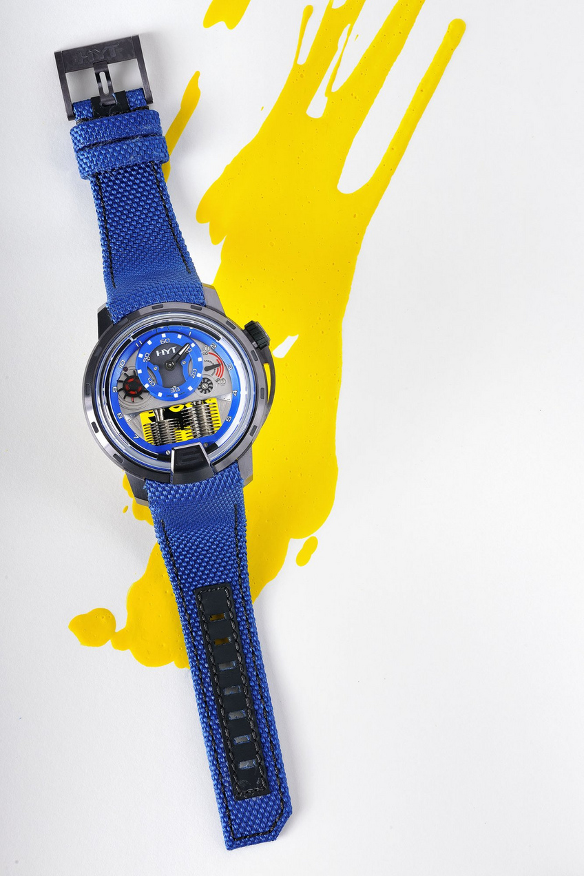 The yellow version is the most distinctive, as this is HYT's trademark colour. Dynamic, flamboyant and radiant, it offers an arresting contrast with the anthracite case in Gun Metal PVD. The blue version is the most subtle, featuring a glacial aura of a surprising depth.