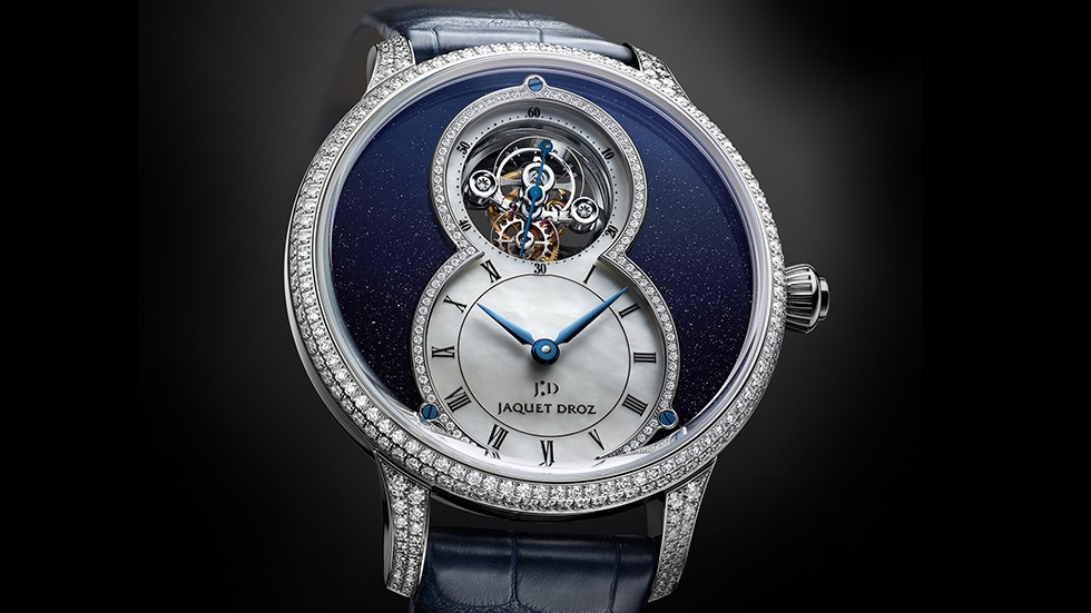 For the first time Jaquet Droz has paired the tourbillon with a mineral dial and has placed this particular complication in a 39 mm case. The self winding mechanism is fitted with a power reserve of 7 days. Only 28 of these exclusive, bewitching timepieces are available.