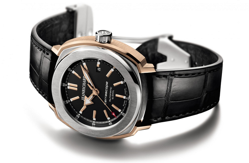 With a steel case illuminated by case sides in pink gold and a black dial, the new Terrascope bi-colour re-interprets the night in a sportive yet elegant spirit. A perfect blend of class and laid-back attitude as well as luxury and authenticity, this model unveils a subtle touch of the "gentleman farmer". The sophisticated construction of the case in multiple parts alternates "vertical satin" surfaces with polished bevels to play with light. The matt black case-back makes the clean geometry of the dial stand out with its applied numerals and big hands covered with pink gold and a luminescent coating. The black alligator strap, with folding clasp, completes the harmony. The mechanical movement with automatic winding ensures that the night-time and day-time hours are told with unerring accuracy. All the JEANRICHARD art of living in a watch with a distinctively assertive character.